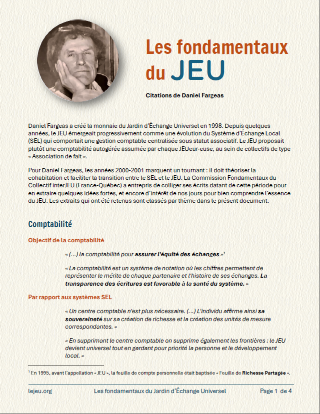 Je pond un texte pour présenter l’ensemble de l’idée. Ma correctrice en orthographe a l’idée de nommer ce système. Elle prend son dictionnaire et trouve le sigle J.E.U., Jardin d’Echange Universel. Ça sonne bien et j’adopte le mot dans une présentation en 4 pages que j’envoie en janvier 98 à tous les SELs de France. »